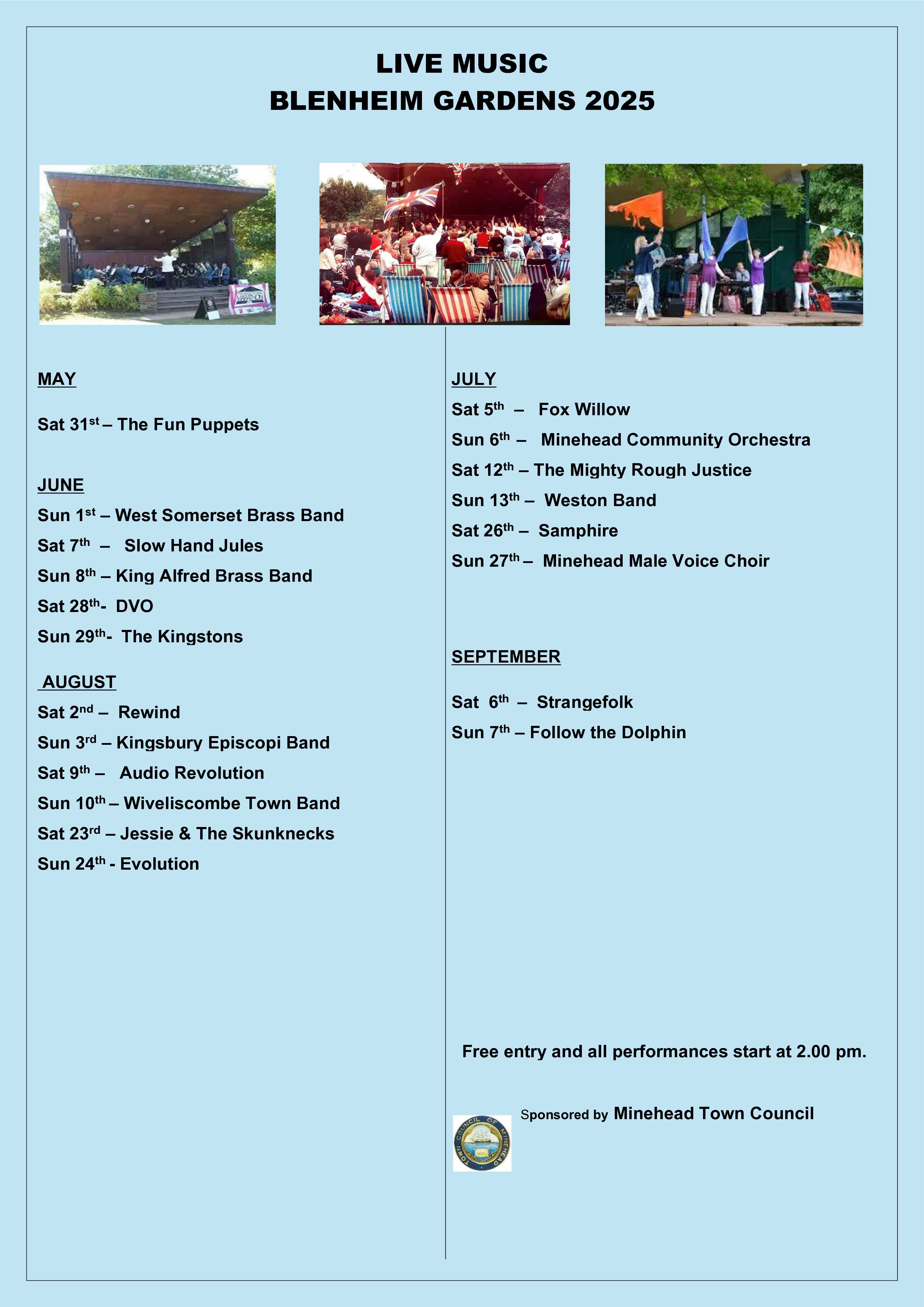 Minehead Town Council is thrilled to announce an extensive line up of live music performances taking place in the picturesque Blenheim Gardens throughout the spring and summer months.